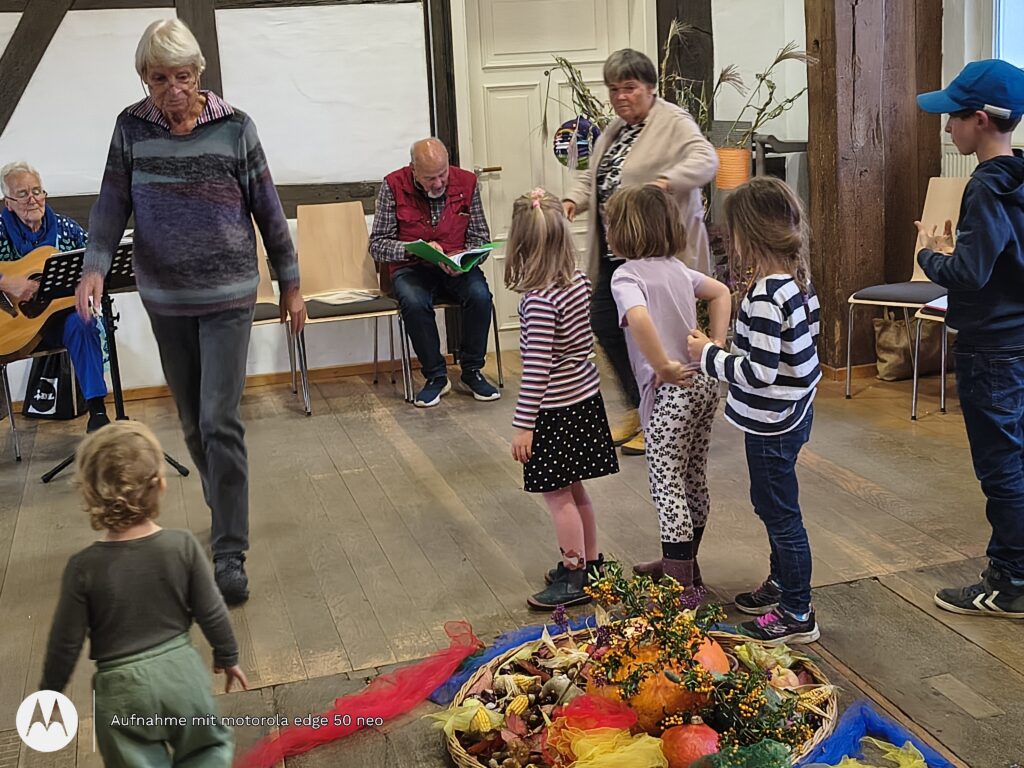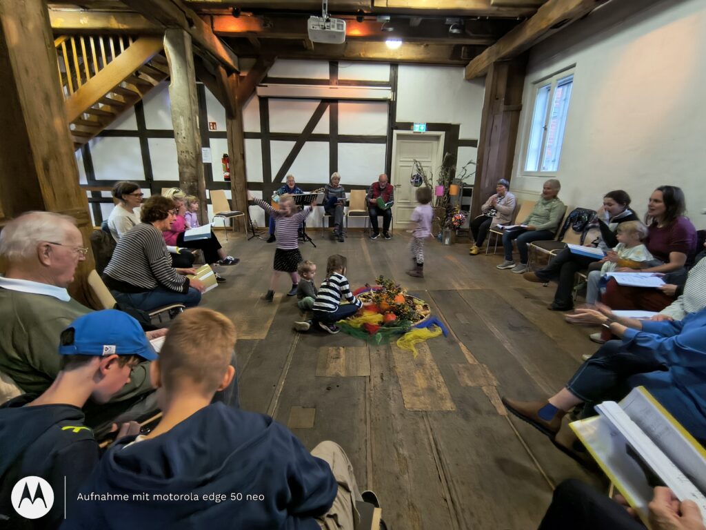 Zum 22.Oktober luden wir Omas und Opas mit deren Enkelkindern in die Wassermühle ein, um hier ein generationsübergreifendes „offenes Kinderliedersingen“ zu veranstalten. Eine über zwanzigköpfige Mitmachfamilie bildete einen Kreis, in dessen Mitte ein großer herbstlich geschmückter Korb stand , um den herum oft singend getanzt wurde.
